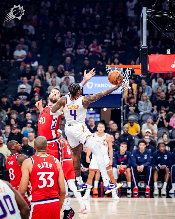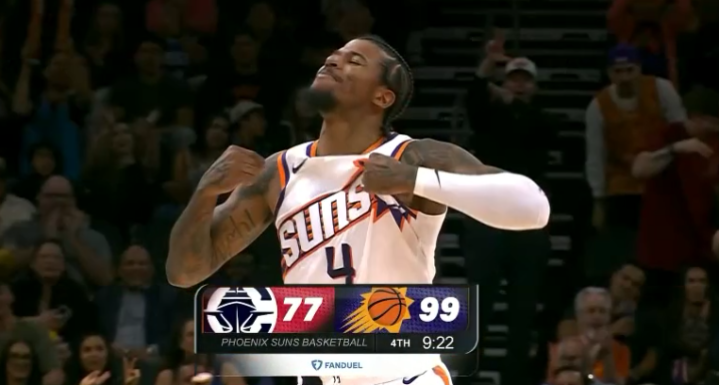 下半场,第三节布克和杰伦-格林带队打出36-13的超级攻势,瞬间领先到20分,之后太阳哑火,快船8-0缩小分差,格雷森-阿伦输送三分,三节打完太阳88-74领先14分,这一节格林和布克合砍16分,太阳主场多次疯狂庆祝。