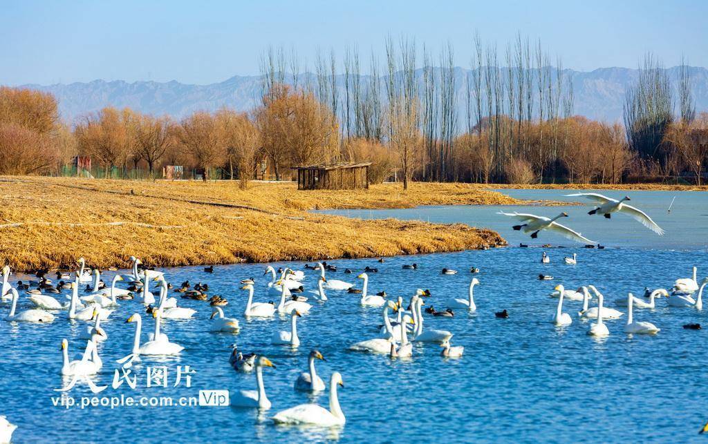 2026年2月24日,甘肃张掖国家湿地公园冰雪逐渐消融,成群的大天鹅、赤麻鸭等候鸟在湖水中游弋、觅食。杨永伟摄(人民图片网)