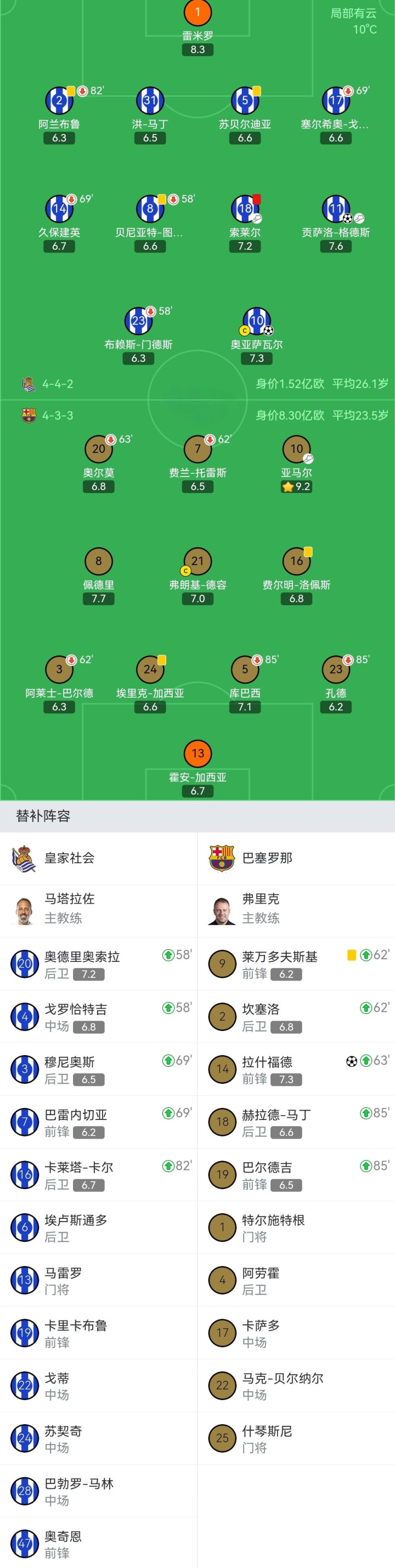 第72分钟,亚马尔助攻,替补出场的拉什福德头球破门,巴萨将比分扳成1-1平。
