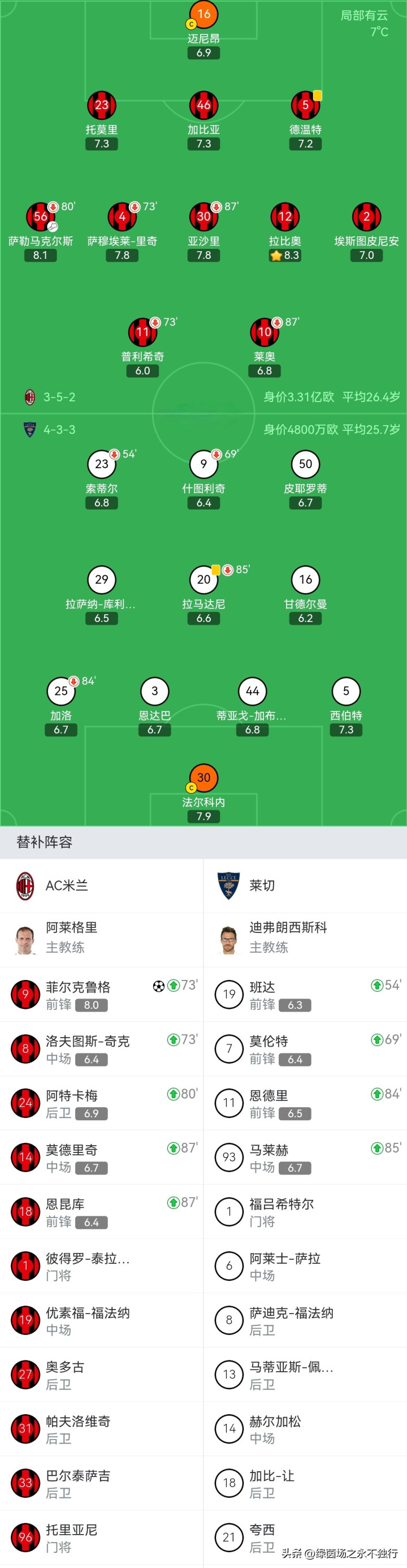 AC米兰队近5场意甲3胜2平状态不错,目前处于争冠区,本场比赛面对降级区的莱切,阿莱格里还是派出了全部主力出战,两队的出场阵容如下。